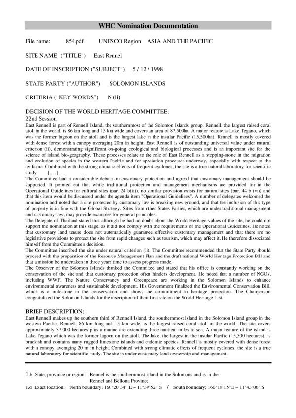 This nomination document is to support the recommendation made in 1989 by the Solomon Island Government that World Heritage listing be pursued for Lake Tegano on East Rennell in Rennell and Bellona Province and for Marovo Lagoon in the Western Province. The New Zealand Government was invited to be the sponsor country to enable the Solomon Islands to become a State Party to the World Heritage Convention and to assist with the procedures for listing. In 1992 the Solomon Islands became a member of the Convention
