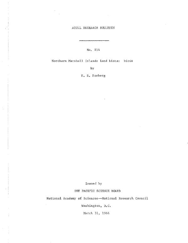 Although ornithological observations have not been the main object of any pliase of our work on the Northern Marshall Islands, numerous notes on birds have accumulated which are here placed on record, The birds were identified by use of Ernst Mayr's "Birds of the Southwest Pacific!' and the names used here are mostly those accepted by Mayr in that work. UnIortunately it was impractical to document these records with specin?ens. The sight observations presented should therefore be acceprcd with some reservations.