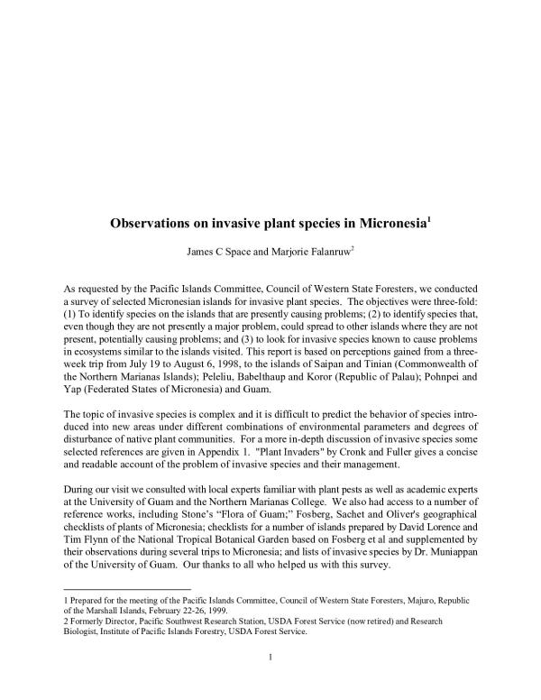 As requested by the Pacific Islands Committee, Council of Western State Foresters, we conducted a survey of selected Micronesian islands for invasive plant species. The objectives were three-fold: (1) To identify species on the islands that are presently causing problems: (2) to identify species that, even though they are not presently a major problem, could spread to other islands where they are not present, potentially causing problems: and (3) to look for invasive species known to cause problems in ecosystems similar to the islands visited. This report is based 011 perceptions gained from a three- week trip from July 19 to August 6, 1998, to the islands of Saipan and Tinian (Commonwealth of the Northern Marianas Islands): Peleliu, Babelthaup and Koror (Republic of Palau); Pohnpei and Yap (Federated States of Micronesia) and Guam.