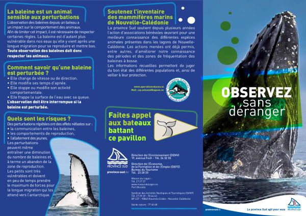 La baleine est un animal sensible aux perturbations Lâobservation des baleines depuis un bateau a un impact sur le comportement des animaux. Afin de limiter cet impact, il est nécessaire de respecter certaines règles. La baleine est dâautant plus vulnérable dans nos eaux quâelle y vient après une longue migration pour se reproduire et mettre bas. Toute observation des baleines doit donc respecter les animaux. Comment savoir quâune baleine est perturbée ? ⢠Elle change de vitesse ou de direction. ⢠Elle modifie ses temps dâapnée. ⢠Elle stoppe ou modifie son activité comportementale. ⢠Elle frappe la surface de lâeau avec sa queue. Lâobservation doit être interrompue si la baleine est perturbée. Quels sont les risques ? Des perturbations répétées ont des effets néfastes sur : ⢠la communication entre les baleines, ⢠les comportements de reproduction, ⢠lâallaitement des jeunes. Les perturbations peuvent même entraîner une diminution du nombre de bale