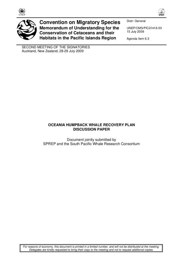 In 2008, the International Union for Conservation of Nature (IUCN) reviewed the conservation status of cetacean populations worldwide. As a consequence of this review, the Oceania population of humpback whales has been re-classified from Threatened to Endangered. This is in recognition that, although humpback whales in many parts of the world are showing encouraging signs of recovery from whaling, most of the small breeding populations in the South Pacific remain at extremely low levels and some remain vulnerable to extinction. The Oceania region encompassed over 9,008,458 km² of ocean, 14 countries and 16 territories spread over both the South and North Pacific Oceans. However, for the purposed of this plan, the planning boundaries are proposed to be delineated by the known breeding range of the Southern Hemisphere humpback whale breading stocks which were reclassified to Endnagered recently by the IUCN (that is Breeding StocksE(ii & iii) and F (i & ii)) and cover the Exclusive Economic Zones which fall within this boundary.