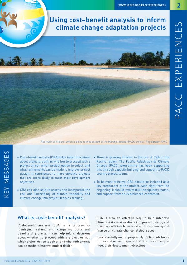Costbenefit analysis (CBA) is a process for identifying, valuing and comparing costs and benefits of projects. It can help inform decisions about whether to proceed with a project or not, which project option to select, and what refinements can be made to improve project design. CBA is also an effective way to help integrate climate risk considerations into project design, and to engage officials from areas such as planning and finance on climate change related issues.