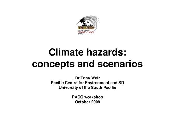 Slide 1Climate hazards: concepts and scenarios Dr Tony Weir Pacific Centre for Environment and SD University of the South Pacific PACC workshop October 2009Outline ⢠Concepts of Risk, Vulnerability, Adaptation ⢠Climate variability and climate change ⢠Climate scenariosKey concepts for any hazard Vulnerability: the potential to be harmed Adaptation: adjustments to reduce vulnerabilityMore on concepts Risk = vulnerability â adaptation Risk = (consequences of hazard) X (probability of hazard) Example : insuring a house against fire, flood or theftClimate already has extremes, to which Pacific people have adaptedAdaptations to predictable climate hazards: examples â Appropriate Technologies (âclimate proofingâ infrastructure â get it right the first time!) - e.g. stilt houses on floodplain â Traditional Knowledge (e.g. drought foods, rebuildable houses) Policy: â âmainstreamingâ, capacity building, disseminating good practice Annee Pacifique de Changement Climatique, 20