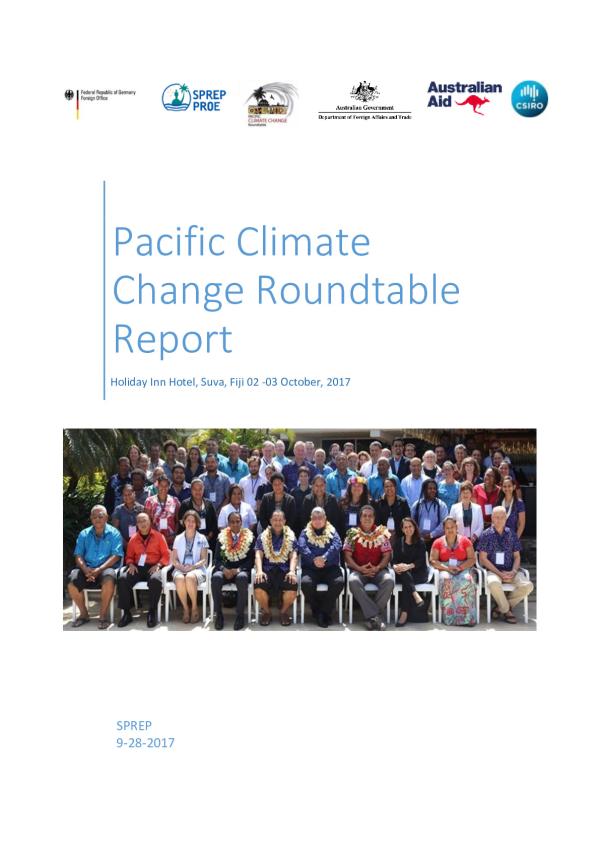 The Pacific Climate Change Roundtable 2017 was made possible with the collaborative support, coordination and financial assistance of the following key partners: · Federal Republic of Germany Foreign Office · Government of Australia · CSIRO · The Secretariat of the Pacific Regional Environment Programme (SPREP) The success of the PCCR belongs with the participants which represented Pacific island government focal points, national and sub-national government representatives, key stakeholders including civil society, non-government organisations, private sector and those integrated across cross-cutting sectors involved in climate change and resilient development in the region. The 2017 PCCR will be the last such meeting in its current format and will be succeeded in 2018 by the Pacific Resilience Meeting. Acknowledgment of the Government of Switzerland is duly noted for its past generous support towards the PCCR from 2008 to 2015.