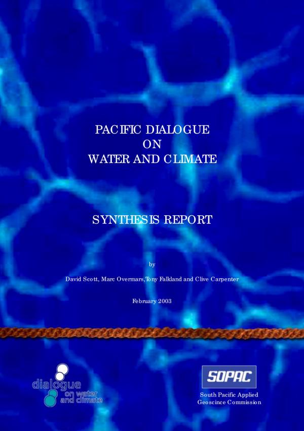 synthesis reportPACIFIC DIALOGUE ON WATER AND CLIMATE SYNTHESIS REPORT by David Scott, Marc Overmars,Tony Falkland and Clive Carpenter February 2003 South Pacific Applied Geoscince CommissionPacific Dialogue on Water and Climate Synthesis Report This document has been edited for publication. Published by South Pacific Applied Geoscience Commission (SOPAC) February 2003Pacific Dialogue on Water and Climate Synthesis Report List of Abbreviations ............................................................................. iii Acknowledgements ............................................................................... iv 1. INTRODUCTION .............................................................................. 1 1.1 The Pacific Dialogue on Water and Climate ............................... 1 1.2 The Pacific Islands ..................................................................... 2 1.3 The Pacific People ..................................................................... 3 1.4 The Pacific Climate .