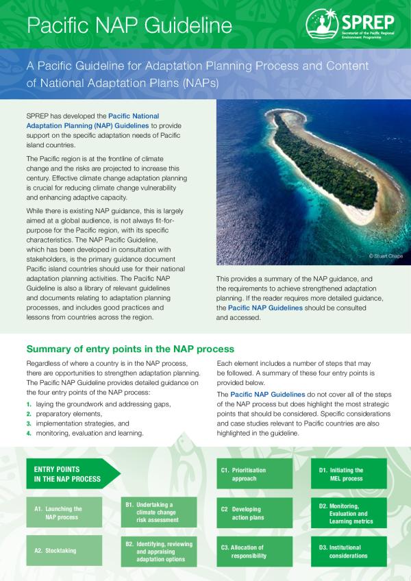 SPREP has developed the Pacific National Adaptation Planning (NAP) Guidelines to provide support on the specific adaptation needs of Pacific island countries.