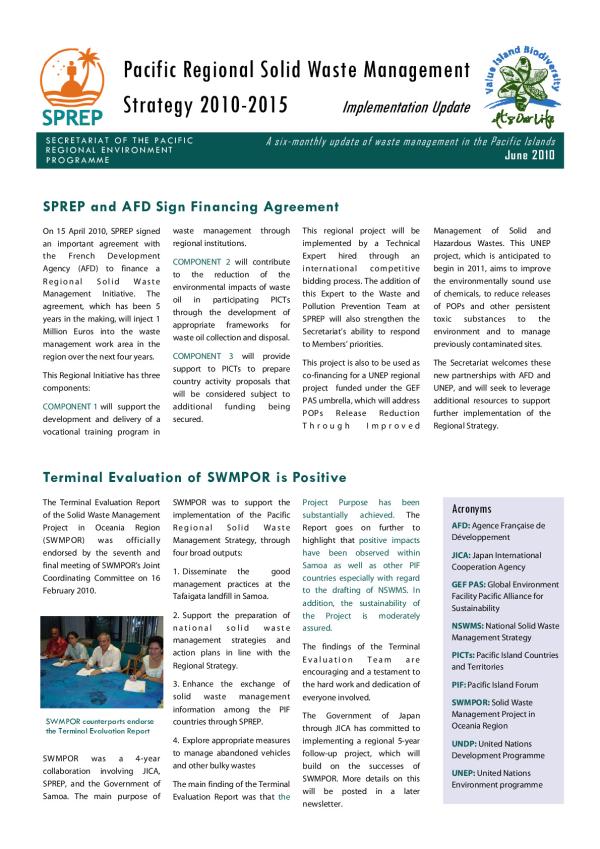 On 15 April 2010, SPREP signed an important agreement with the French development Agency (AFD) to finance a R e g i o n a l S o l i d W a s t e Management Initiative. The agreement, which has been 5 years in the making, will inject 1 Million Euros into the waste management work area in the region over the next four years