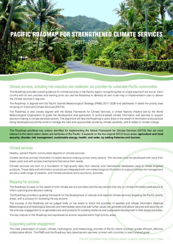 The Roadmap prioritises key actions identified for implementing the Global Framework for Climate Services (GFCS) that are most relevant to the island nation states and territories of the Pacific. It expands on the five original GFCS focus areas: agriculture and food security; disaster risk management; sustainable energy; health; and water, by adding fisheries and tourism.