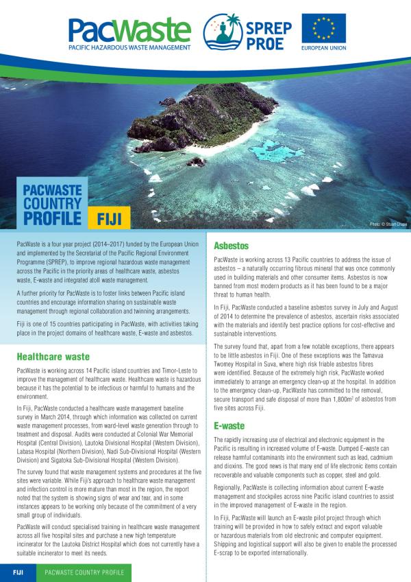 PACWASTE COUNTRY PROFILEFIJI PacWaste is a four year project (2014â2017) funded by the European Union and implemented by the Secretariat of the Pacific Regional Environment Programme (SPREP), to improve regional hazardous waste management across the Pacific in the priority areas of healthcare waste, asbestos waste, E-waste and integrated atoll waste management. A further priority for PacWaste is to foster links between Pacific island countries and encourage information sharing on sustainable waste management through regional collaboration and twinning arrangements. Fiji is one of 15 countries participating in PacWaste, with activities taking place in the project domains of healthcare waste, E-waste and asbestos. Healthcare waste PacWaste is working across 14 Pacific island countries and Timor-Leste to improve the management of healthcare waste. Healthcare waste is hazardous because it has the potential to be infectious or harmful to humans and the environment. In Fiji, PacWaste conducted a healt
