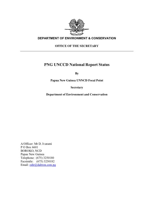This report is to update the UNNCD Regional Secretariat and SPREP on the latest development on the implementation of the UNCCD in Papua New Guinea. Papua New Guinea ratified the Convention in December 2000. The Focal point was transferred to the Secretary. Department of Environment and Conservation in May, 2001 and the Action Office was taken up by the Greenhouse Unit, Office of the Secretary. So far PNG has not attended any UNCCD COP Meeting after it ratified the Convention. However PNG did attend the Pacific and Asia Pacific Regional Meetings in 2001.