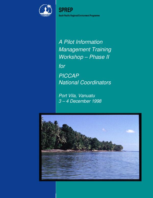 \\Matuu\Publications\PUBLIS~1\ESPREP South Pacific Regional Environment Programme A Pilot Information Management Training Workshop â Phase II for PICCAP National Coordinators Port Vila, Vanuatu 3 â 4 December 1998© South Pacific Regional Environment Programme, 1999. The South Pacific Regional Environment Programme authorises the reproduction of this material, whole or in part, in any form provided appropriate acknowledgement is given. Original Text: English SPREP Library Cataloguing-in-Publication Data Information Management Workshop [for] PICCAP National Coordinators (1998: Port Vila, Vanuatu). A Pilot Information Management Training Workshop â Phase II for PICCAP National Coordinators, Port Vila, Vanuatu, 3â4 December, 1998. â Apia, Samoa: SPREP, 1999. iv, 25 p.; 29 cm ISBN: 982-04-0199-2 1. Information resource management â Climatic factors â Oceania. 2. Management information system â Climatic factors â Oceania. I. South Pacific Regional Environment Programme (SPREP). II. Pacific Island