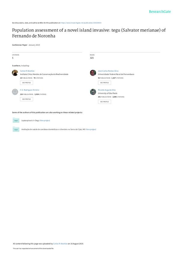 Fernando de Noronha is an oceanic archipelago in the Atlantic Ocean, 345 km off shore from the Brazilian coast. It comprises 21 islands and islets, of which the main island (FN) is 17 km2 with a rapidly growing tourism industry in the last decades. Despite being a protected area and bearing Ramsar and UNESCO World Heritage site status, it is threatened by multiple terrestrial invasive species since its colonisation in the early 16th century. Invasive species and the increasing tourism contributes to a list of at least 15 endangered or critically endangered species according to IUCN criteria. The black and white tegu (Salvator merianae) is the largest lizard in South America, occurring in most of the Brazilian territory and reaching up to 8 kg and 1.6 m from head to tail. As an omnivorous and opportunistic lizard, it feeds on a variety of available items, including smaller vertebrates and eggs. The introduction of the tegu to FN as well as its immediate impact on local fauna were not recorded; however, its ongoing impact is expected to be high. We captured and marked 103 tegu in FN during the months of February and November of 2015 and 2016. We also counted animals by line-transect census in a sparsely inhabited and an uninhabited area of FN. Body size affected the capture probabilities, while season and sex had little or no effect. Densities estimated by capture-recapture in the sparsely inhabited area varied from 2.29 to 8.28 animals/ha according to sampling season. Line transect census in the same area revealed a density of 3.98 (±1.1) animals/ha and in the uninhabited area 13.83 (±3.9) animals/ha. Home range was 10.54 ha, ranging from 7.36 to 15.33 hectares. Tegu activity decreased in the months of July and August of 2015. Results from this study can assist conservation managers and decision makers to implement a science-based tegu management programme in the future.