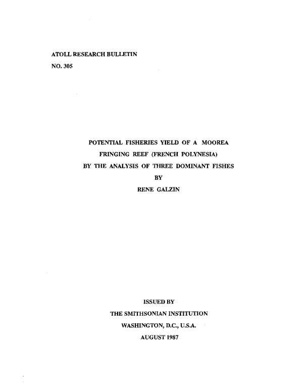 Recent studies have shown that many coral reefs are capable of yielding a total fish catch of 18- 24 T.Km-2 (Hill, 1978; Alcala, 1981; Munro, 1987). There are, however, no estimates for the productivity and yield of fishes associated with coral reefs in French Polynesia. This study was designed to determine the fisheries yield from a part of the fringing reef on the island of Moorea, French Polynesia.