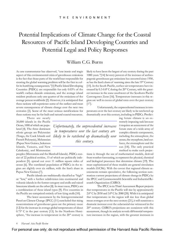 As one commentator has observed, one ironic and tragic aspect of this environmental crisis of greenhouse emissions is the fact that those parts of the world least responsible for creating the global warming problem will be the first to suffer its horrifying consequences.[1] Pacific Island Developing Countries (PIDCs) are responsible for only 0.03% of the worlds carbon dioxide emissions, and the average island resident produces only one quarter of the emissions of the average person worldwide [2]. However, it is anticipated that these nations will experience some of the earliest and most severe consequences of climate change over the next two centuries [3]. Some of the most serious ramifications for these nations may be for built and natural coastal resources