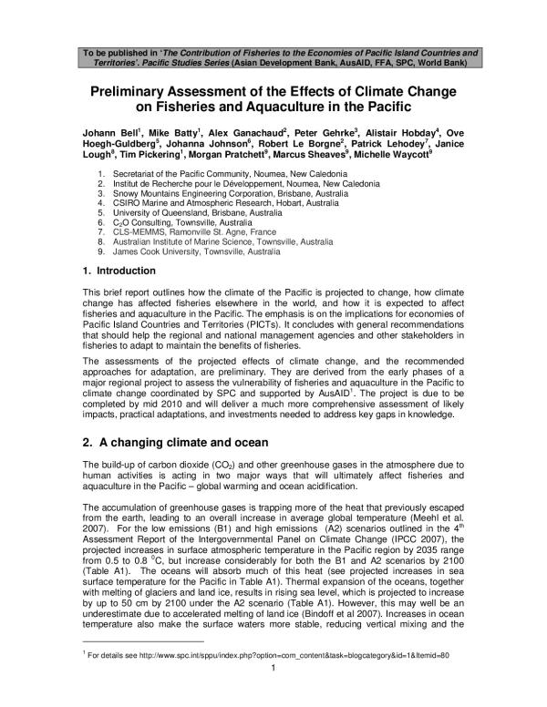 This brief report outlines how the climate of the Pacific is projected to change, how climate change has affected fisheries elsewhere in the world, and how it is expected to affect fisheries and aquaculture in the Pacific. The emphasis is on the implications for economies of Pacific Island Countries and Territories (PICTs). It concludes with general recommendations that should help the regional and national management agencies and other stakeholders in fisheries to adapt to maintain the benefits of fisheries. The assessments of the projected effects of climate change, and the recommended approaches for adaptation, are preliminary. They are derived from the early phases of a major regional project to assess the vulnerability of fisheries and aquaculture in the Pacific to climate change coordinated by SPC and supported by AusAID1. The project is due to be completed by mid 2010 and will deliver a much more comprehensive assessment of likely impacts, practical adaptations, and investments needed to address key gaps in knowledge.