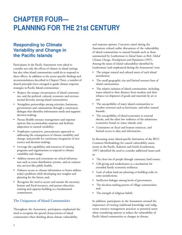 "The impacts of the 1997-1998 El Nino are fresh in our minds, and the latest reports from the work of the Intergovernmental Panel on Climate Change (IPCC) confirm tvhat all of you already know changes in climate matter to individuals, communities, businesses and governments who call islands home. Your valuable natural resources, traditional ways of life, critical economic sectors, community support infrastructure, atid, to a great extent, your future, depend on developing an effective response to the challenges presented by climate variability and change."