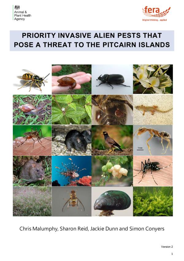 The purpose of this guide is to provide simple factsheets on priority invasive alien pests that currently threaten plant health, human health and/or biodiversity in the Pitcairn Islands (Pitcairn, Henderson, Ducie and Oeno Islands), a UK Overseas Territory located in the southern Pacific Ocean. It also identifies the main pathways of introduction so that biosecurity inspections can be targeted. The guide is intended to be used by those working in biosecurity, and by all those interested in preserving the unique environments and biodiversity found in the Pitcairn Islands. The guide will not enable the user to accurately confirm the identity of the species of suspected invasive alien pest included in this guide, and further assistance will be required from a relevant specialist.