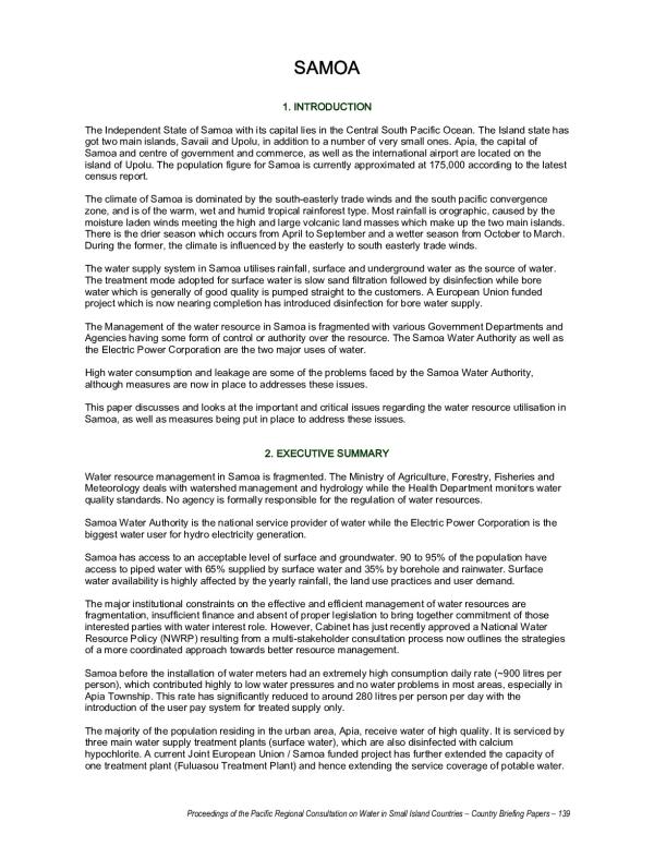 Water resource management in Samoa is fragmented. The Ministry of Agriculture, Forestry, Fisheries and Meteorology deals with watershed management and hydrology while the Health Department monitors water quality standards. No agency is formally responsible for the regulation of water resources. Samoa Water Authority is the national service provider of water while the Electric Power Corporation is the biggest water user for hydro electricity generation.