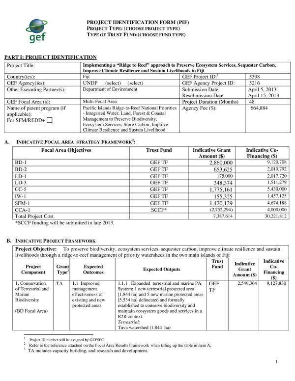 Information on the Project Identification Form - Implementing a "Ridge to Reef" approach to Preserve Ecosystem Services, Sequester Carbon, Improve Climate Resilience and Sustain Livelihoods in Fiji