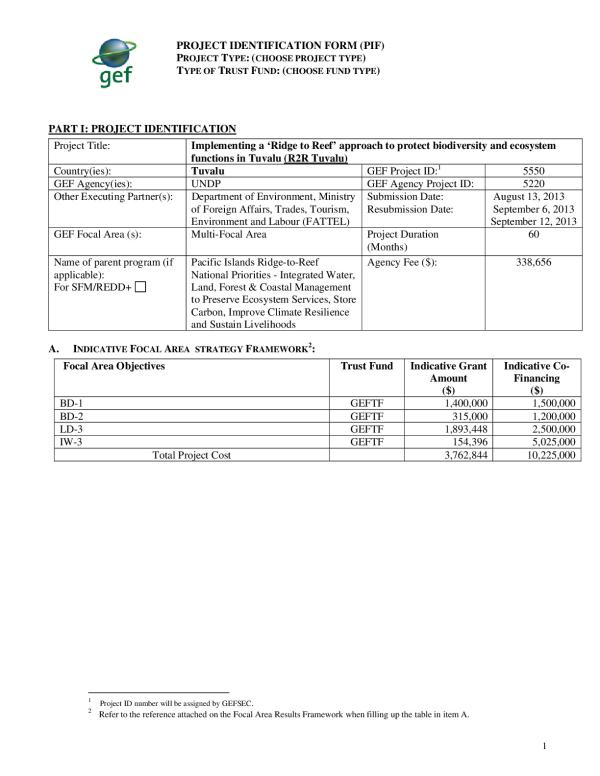 Project Identification Form: Implementing a 'Ridge to Reef' approach to protected biodiversity and ecosystem functions in Tuvalu (R2R Tuvalu)