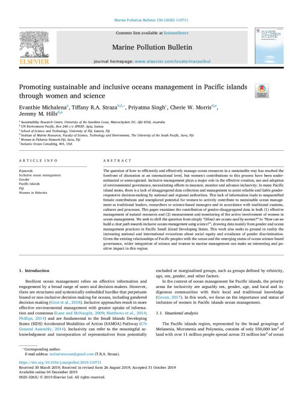 The question of how to efficiently and effectively manage ocean resources in a sustainable way, has reached therefore front of discussion at an international level, but women's contributions to this process have been under-estimated or unrecognized. Inclusive management plays a major role in the effective creation, use and adoption of environmental governance, necessitating efforts to measure, monitor and advance inclusivity. In many Pacific island states, there is a lack of disaggregated data collection and management to assist reliable and liable gender-responsive decision-making by national and regional authorities. This lack of information leads to unquantified female contributions and unexplored potential for women to actively contribute to sustainable ocean management as traditional leaders, researchers or science-based managers and in accordance with traditional customs, cultures and processes. This paper examines the contribution of gender-disaggregated data in both (1) effective management of natural resources and (2) measurement and monitoring of the active involvement of women in ocean management. We seek to shift the question from simply (How)are oceans used by women? to How can we build a clear path towards inclusive oceans management using science?, drawing data mainly from gender and ocean management practices in Pacific Small Island Developing States. This work also seeks to ground in reality the increasing national and international evocations about social equity and avoidance of gender discrimination. Given the existing relationships of Pacific peoples with the ocean and the emerging status of ocean science-based governance, wider integration of science and women in marine management can make an interesting and positive impact in this region