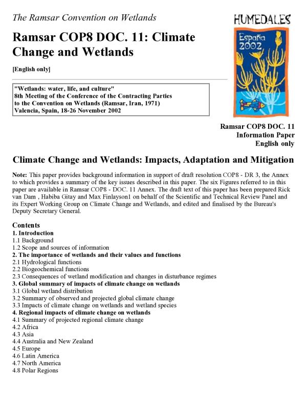 This paper has been prepared by the Scientific and Technical Review Panel (STRP) of the Convention on Wetlands (Ramsar, Iran, 1971) in response to Action 5.1.6 of the Convention's Work Plan 2000-2002, which requested the STRP to prepare for consideration at the 8th meeting of the Conference of the Parties (COP8) a comprehensive review of the potential impacts of climate change on wetlands and the roles that wetlands can potentially play in mitigating the effects of climate change and sea level rise