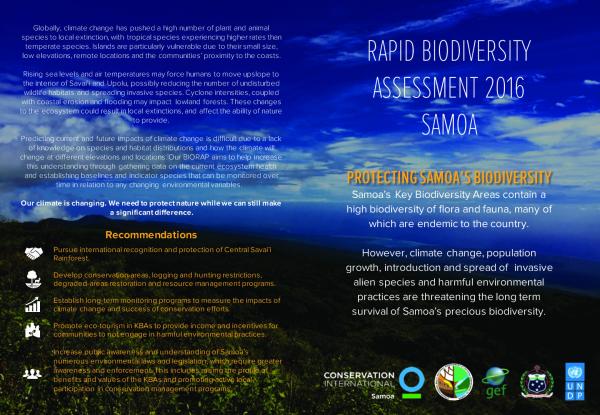 Protecting Samoa's biodiversity; Samoa's key biodiversity areas contain a high biodiversity of flora and fauna many of which are endemic to the country. However climate change, population growth introduced and spread of invasive alien species and harmful environmental practices are threating the long term survival of Samoa's precious biodiversity