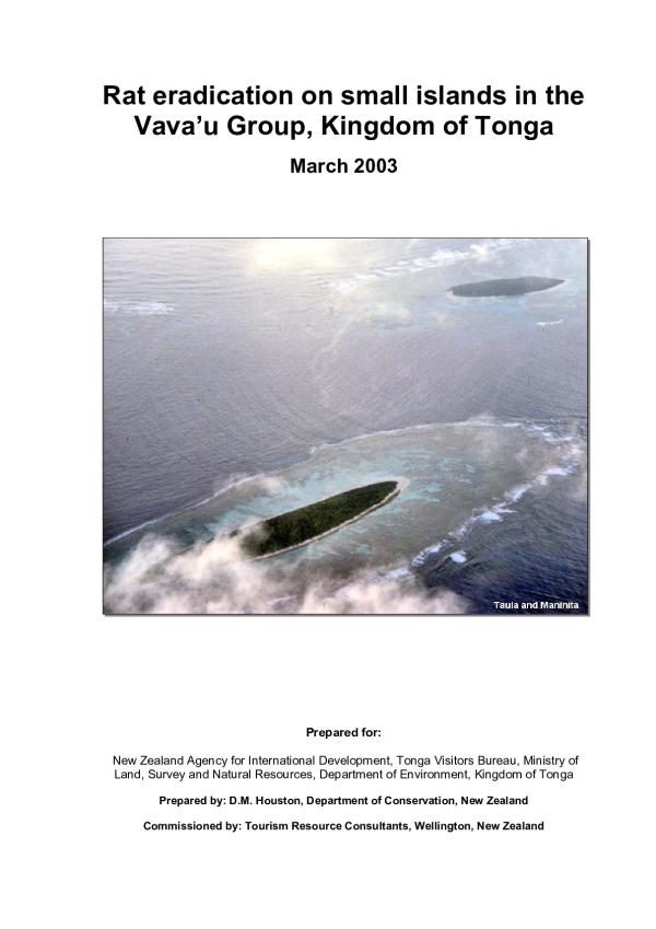 In June/July 2002 the eradication of Pacific rats from Maninita Island in the Vava'u group of the Kingdom of Tonga was attempted using Brodifacoum pellets in bait stations. In December 2002, Maninita was revisited and rat trapping carried out to determine if rats were present. While no rats were caught and none were seen, further monitoring in June 2003 is recommended before the island is declared "rat free '. Using the same techniques used on Maninita, the eradication of rats on neighbouring Taula and Lua Loli was attempted. Despite poor weather delaying rebaiting visits to the islands, the operation thus far appears successful. Permanent bait stations set up on Maninita to minimise the risk of rats re-invading the island were found to have been tampered with and evidence of booby chick harvesting was seen on Taula. Regular visits to the islands to maintain bait stations and maintain a presence are recommended.