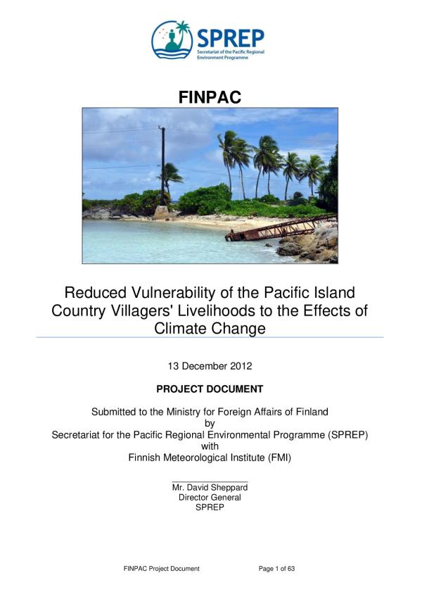 Project Plan FINPAC Project Document Page 1 of 63 FINPAC Reduced Vulnerability of the Pacific Island Country Villagers' Livelihoods to the Effects of Climate Change 13 December 2012 PROJECT DOCUMENT Submitted to the Ministry for Foreign Affairs of Finland by Secretariat for the Pacific Regional Environmental Programme (SPREP) with Finnish Meteorological Institute (FMI) ________________ Mr. David Sheppard Director General SPREP FINPAC Project Document Page 2 of 63 PROJECT FACT SHEET Project Title FINPAC Reduced vulnerability of the Pacific Island Country villagers' livelihoods to the effects of Climate Change Project Number MFA Intervention Code: Sector Climate Change, Poverty Reduction, Disaster Risk Reduction, Focus Weather and Climate Services, Early Warning Services, Community Response Geographical Coverage and Project Site Pacific Islands Countries (Cook Islands, Federated States of Micronesia, Fiji, Kiribati, Marshall Islands