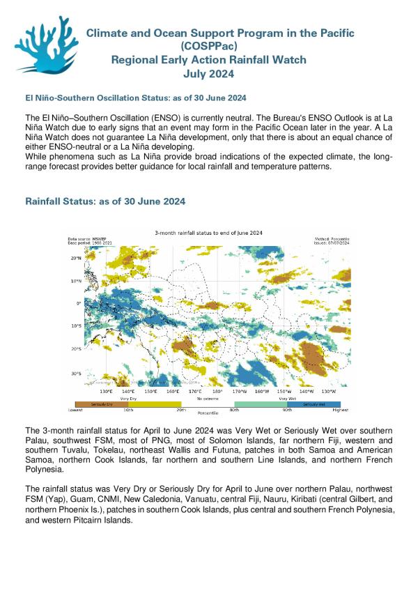 The 3-month rainfall status for April to June 2024 was Very Wet or Seriously Wet over southern Palau, southwest FSM, most of PNG, most of Solomon Islands, far northern Fiji, western and southern Tuvalu, Tokelau, northeast Wallis and Futuna, patches in both Samoa and American Samoa, northern Cook Islands, far northern and southern Line Islands, and northern French Polynesia.