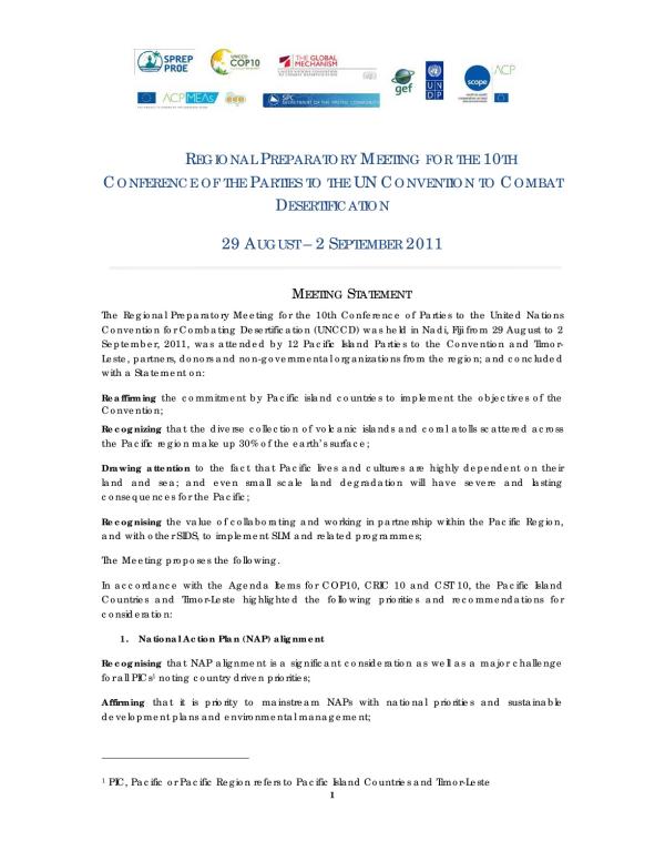 The Regional Preparatory Meeting for the 10th Conference of Parties to the United Nations Convention for Combating Desertification (UNCCD) was held in Nadi, Fiji from 29 August to 2 September, 2011, was attended by 12 Pacific Island Parties to the Convention and TimorLeste, partners, donors and non-governmental organizations from the region