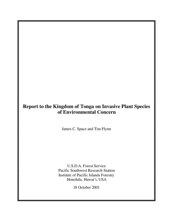 The Kingdom of Tonga requested assistance from the US Department of Agriculture. Forest Service,Institute of Pacific Islands Forestry, to conduct a survey of invasive plant species of environmental concern, similar to surveys previously conducted in Micronesia. American Samoa and Niue. The survey was carried out from 5-20 July 2001. The islands of Tongatapu. Eua, Vava'u, Ha'ano, Lifiika, Foa and Uilia were surveyed. The latter four islands are in the Ha'apai group of islands. The survey of Ha'ano was not as thorough as we would have liked because stormy weather forced us to return to Lifnka. The objectives, as with previous surveys, were to: (1) identify plant species that are presently causing problems to natural and semi-natural ecosystems; (2) identify species that, even though they are not presently a major problem, could spread more widely or are known to be problem species elsewhere: (3) confirm the absence of species that are a problem elsewhere and if introduced to Tonga, could be a threat there: and (4) make appropriate recommendations.
