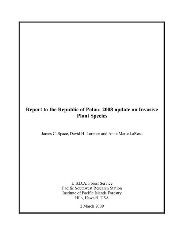 In 2002, The Republic of Palau requested assistance from the US Department of Agriculture, Forest Service, Institute of Pacific Islands Forestry, to conduct a survey of invasive plant species of environmental concern. A comprehensive survey of the entire country was conducted and a report of the findings was submitted to the Government of Palau in 20032. This superseded a more cursory survey of the major species of environmental concern conducted in 19983. The present survey was requested as a follow-up to the 2002 survey.