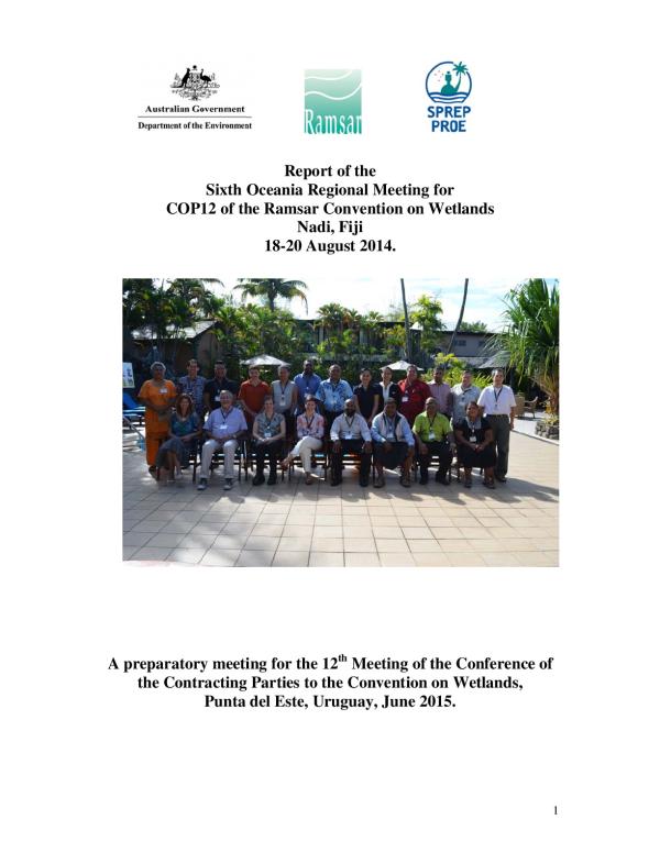 The 6th Oceania Regional Meeting was held at the Tanoa International hotel in Nadi, Fiji from 18th to 20th August 2014. The meeting was co-organized by SPREP and the Ramsar Convention Secretariat and hosted by the Government of Fiji. Funding assistance for the meeting was provided by the Government of Australia and from the Ramsar Convention Secretariat, through voluntary contributions.