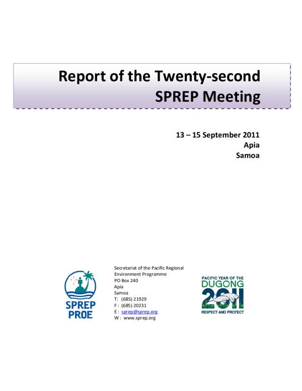 The 22nd SPREP Meeting (22SM) was convened in Apia, Samoa from 13 to 15 September 2011. Representatives of the following SPREP countries and territories attended: American Samoa, Australia, Cook Islands, Federated States of Micronesia, France, French Polynesia, Marshall Islands, Nauru, New Caledonia, New Zealand, Niue, Papua New Guinea, Samoa, Solomon Islands, Tonga, United States of America and Vanuatu. Ministers from French Polynesia, Solomon Islands and Vanuatu were present. Observers from a range of regional, international and non?governmental organisations (NGOs) also attended. A list of participants is attached as Annex 1.
