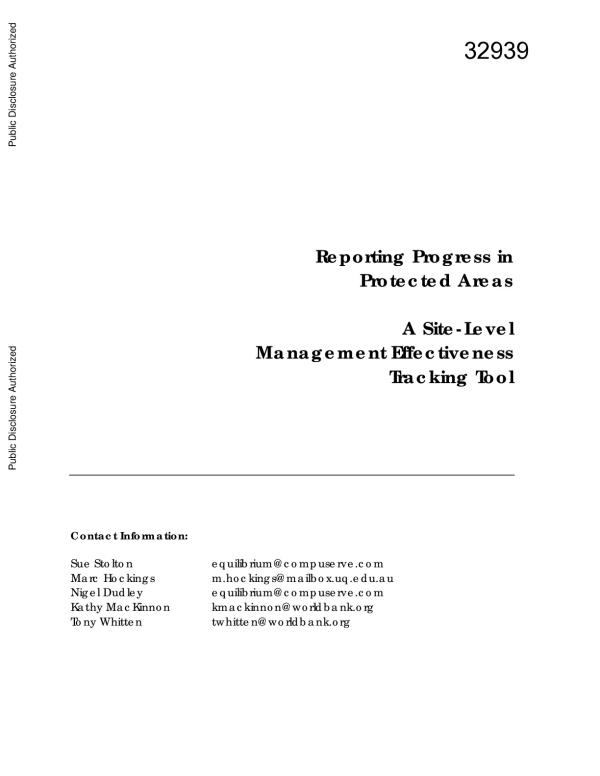 ReportingProgressInProtectedAreasToolInEnglish2003.PDF Reporting Progress in Protected Areas A Site-Level Management Effectiveness Tracking Tool Contact Information: Sue Stolton [email protected] Marc Hockings [email protected] Nigel Dudley [email protected] Kathy MacKinnon [email protected] Tony Whitten [email protected] P u b lic D is cl o su re A u th o ri ze d P u b lic D is cl o su re A u th o ri ze d P u b lic D is cl o su re A u th o ri ze d P u b lic D is cl o su re A u th o ri ze d Printed in May 2003 © World Bank/WWF Alliance for Forest Conservation and Sustainable Use. The Management Effectiveness Tracking Tool is a working document, and will be periodically updated based on experience with its implemen tation. Any such revisions will be reprinted accordingly. Contents Background 1 The WCPA Framework 1 Purpose of the Management Effectiveness Tracking Tool 3 Guidance