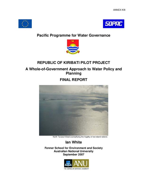 The European Union has established a Programme for Water Governance (PfWG), for three regions, Africa, the Caribbean and the Pacific. A successful Pacific region submission in 2002 by the South Pacific Applied Geoscience Commission (SOPAC) proposed three pilot studies in Fiji Islands, Kiribati, and the Solomon Islands for water governance at different scales: national, major utility and local village, island or catchment based. Increasing demographic trends, hydrogeology, climatic variation and change, urbanisation and the impacts of human activities all combine to impose significant risks to water resources in small island nations. The challenges faced in the water and sanitation sector in small island states are amongst the most difficult in the world. They require a strategic, coordinated whole-of-government approach, in partnership with island communities, that incorporates the existing expertise and experience throughout the government and community sectors and which represents the hopes and needs of communities for adequate water and sanitation.