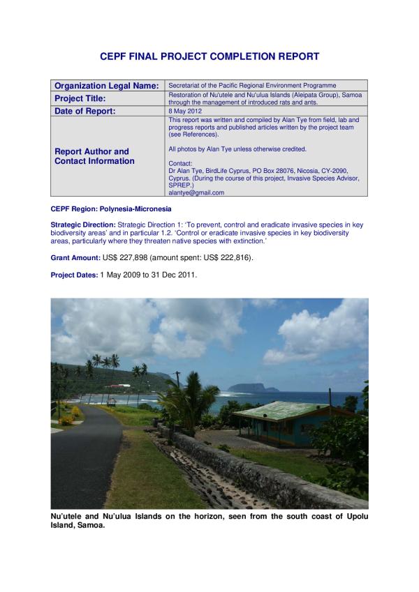 Microsoft Word - FinalRep.docCEPF FINAL PROJECT COMPLETION REPORT Organization Legal Name: Secretariat of the Pacific Regional Environment Programme Project Title: Restoration of Nu'utele and Nu'ulua Islands (Aleipata Group), Samoa through the management of introduced rats and ants. Date of Report: 8 May 2012 Report Author and Contact Information This report was written and compiled by Alan Tye from field, lab and progress reports and published articles written by the project team (see References). All photos by Alan Tye unless otherwise credited. Contact: Dr Alan Tye, BirdLife Cyprus, PO Box 28076, Nicosia, CY-2090, Cyprus. (During the course of this project, Invasive Species Advisor, SPREP.) [email protected] CEPF Region: Polynesia-Micronesia Strategic Direction: Strategic Direction 1: âTo prevent, control and eradicate invasive species in key biodiversity areasâ and in particular 1.2. âControl or eradicate invasive species in key biodiversity areas, particularly where