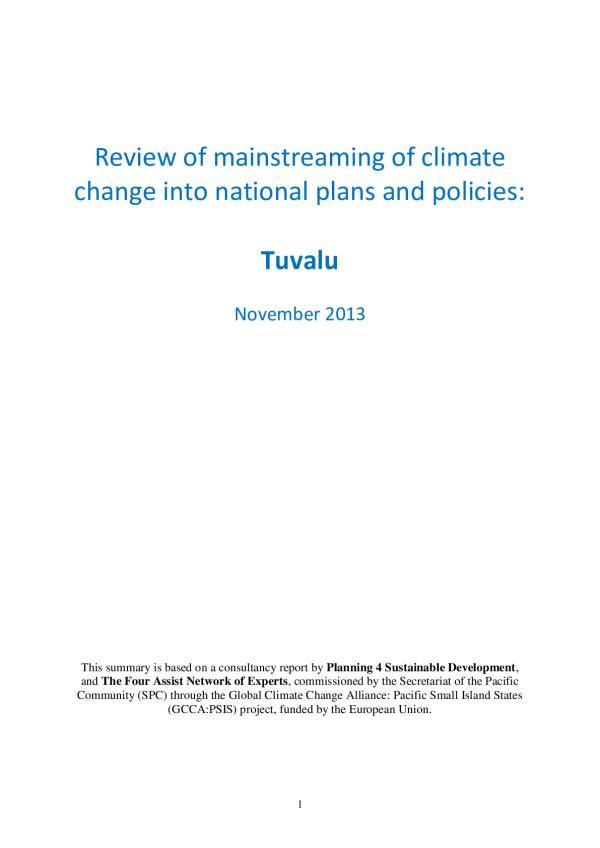 The purpose of this report is to summarise a review of the degree to which climate change has so far been mainstreamed in national strategic plans, policies and budgets, and in a sectoral case study (presented in Annex 1) the extent to which mainstreaming has translated to implementation. Table 1 shows the criteria used in this review to assess the degree of mainstreaming of climate change, as well as some general remarks in relation to the reviews findings for Tuvalu.