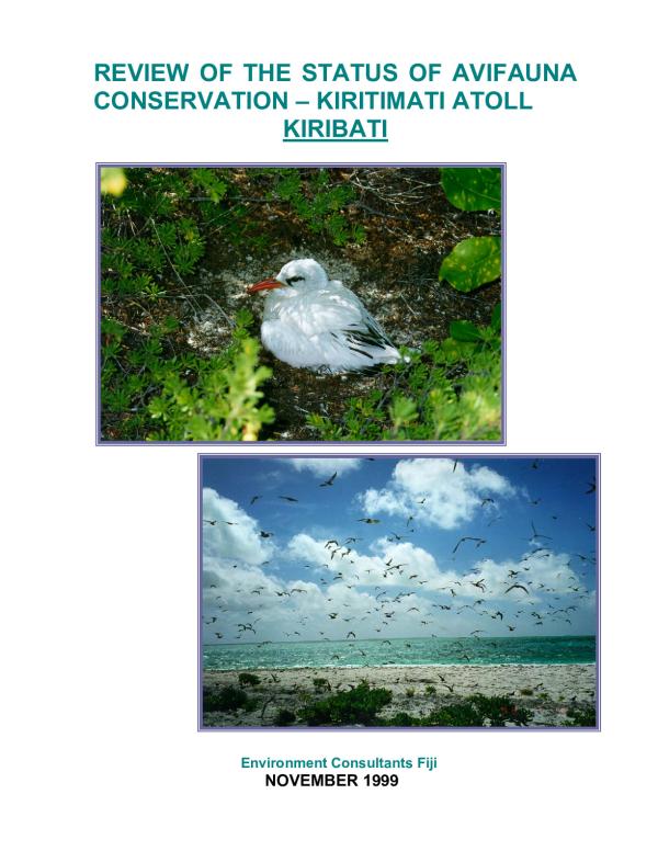 Kiritimati Atoll's avifauna has regional and international significance. The Atoll provides nesting, roosting, feeding and migration sites for over 40 bird species, but it is 18 species of seabirds and their breeding numbers which are of particular significance. The main purpose of the assignment reported here is to review current avifauna conservation management on Kiritimati; assess, to the extent possible, the status of bird species and populations; and, in the context of the current issues and projects planned for Kiritimati, provide recommendations for immediate and future conservation management.