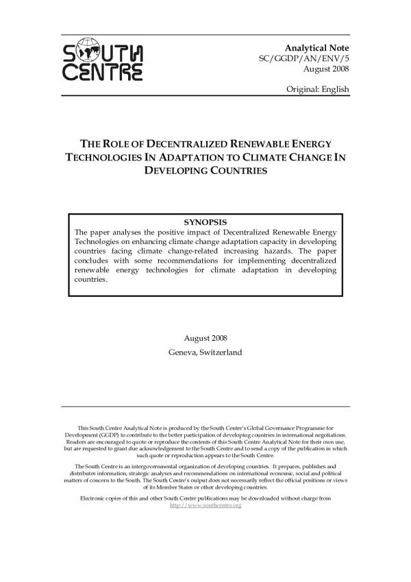 The paper analyses the positive impact of Decentralized Renewable Energy Technologies on enhancing climate change adaptation capacity in developing countries facing climate change-related increasing hazards. The paper concludes with some recommendations for implementing decentralized renewable energy technologies for climate adaptation in developing countries