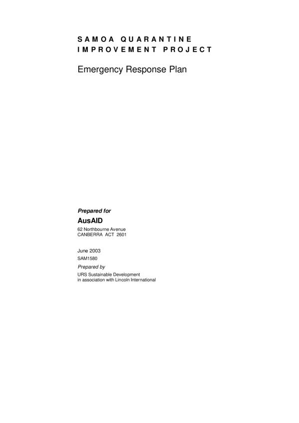 As we experienced with the Taro Leaf Blight outbreak in the 1990s, the introduction of exotic pests or diseases into Samoa can have disasterous effects on our people and on our economy. We learned much from the Taro Leaf Blight outbreak, not the least being that it is important that we are better prepared to managed such an exotic pest incursion to prevent it spreading, and to eradicate it before it has time to become established anywhere on our islands. The Emergency Response Plan outlined in this document has been prepared as a part of the Ministry of Agriculture, Foresty, Fisheries and Meteorology's efforts to strengthen our overall biosecurity, from our border control, to our surveillance capability, and on to our ability to respond quickly in effectively eradicating an exotic pest. This Plan is a guide for us to carry out an Emergency Response, outlining the management structures and operational steps we need to take to implement a successful eradication or control programme.