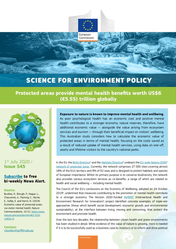 Exposure to nature is known to improve mental health and wellbeing. As poor psychological health has an economic, cost and positive mental health contributes to a stronger economy, nature reserves, therefore have additional economic value, alongside the value arising from ecosystem services and tourism, through their beneficial impact visitors' wellbeing.