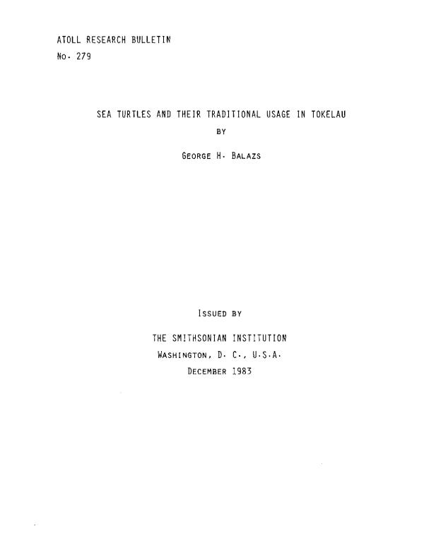 The conservation status, ecology, and cultural importance of sea turtles at the three Polynesian atolls of Tokelau are presented. The green turtle, Chelonia mydas. is the most common species, occurring as a migrant breeder mostly during September through November. The hawks- bill, Eretmochelvs imbricata. is present in small numbers at all three atolls, but nesting is only known at Nukunonu Atoll. A third species, the loggerhead, Caretta caretta. has also been recorded on rare occasions. In Tokelau, sea turtles are considered "sacred fish" (ika ha) that must be shared among the entire village by an equitable system known as inati. The number of sea turtles has declined within historical times apparently as a result of modern and more efficient hunting methods.