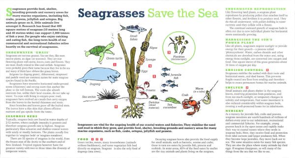 Seagrasses provide food, shelter, breeding grounds and nursery aneas for many marine organisms, including fish, crabs, prawns, jellyfish and octopus. Big anirnals graze on it, little animals live amongst it. Research has found that 400 square metres of seagrass (10 metres long and 40 metres wide) can support 2,000 tonnes of fish a ye.rr. For people who enjoy catching and eating fish, the long-term health of our commercial and recreational iisheries relies heavily on the survival of seagrasses.