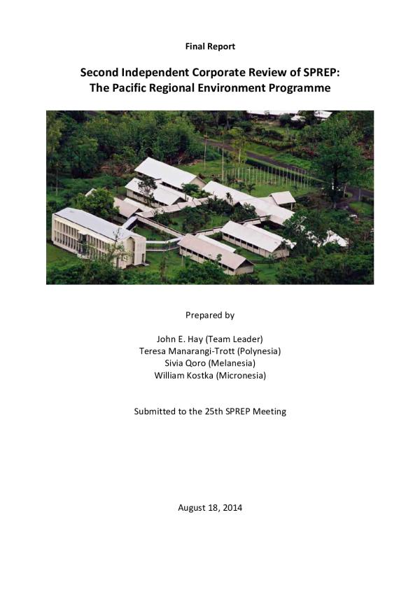 This draft final report presents and interprets the evidence gathered by an Independent Review Team commissioned by the Pacific Regional Environment Programme (SPREP) to undertake the Second Independent Corporate Review. Interpretation of this evidence leads to several recommendations that are designed to further enhance the effectiveness, efficiency and relevance of the work of both the Secretariat and the wider Organisation.