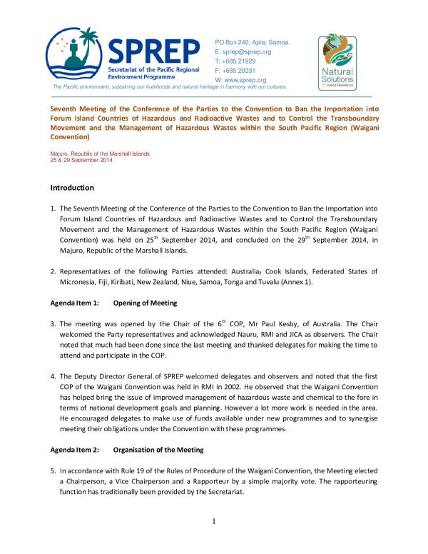 The Seventh Meeting of the Conference of the Parties to the Convention to Ban the Importation into Forum Island Countries of Hazardous and Radioactive Wastes and to Control the Transboundary Movement and the Management of Hazardous Wastes within the South Pacific Region (Waigani Convention) was held on 25th September 2014, and concluded on the 29th September 2014, in Majuro, Republic of the Marshall Islands.