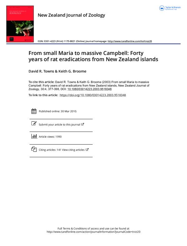 Over the last four decades the eradication of rats from islands around New Zealand has moved from accidental eradication following the exploratory use of baits for rat control to carefully planned complex eradications of rats and cats (Feliscatus) on large islands. Record Created: 22-Nov-2018