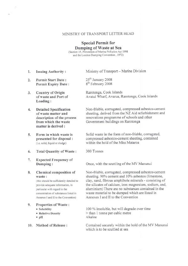 Non-friable, corrugated, compressed asbestos-cement sheeting, derived from the NZ Aid refurbishment and renovations programme of schools and other Government buildings on Rarotonga