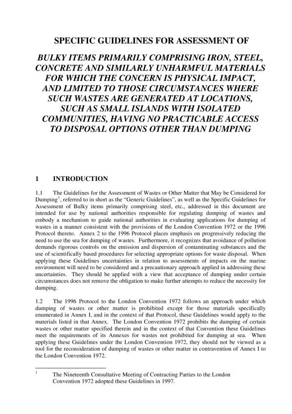 The Guidelines for the Assessment of Wastes or Other Matter that May be Considered for Dumping, referred to in short as the "Generic Guidelines'; as well as the Specific Guidelines for Assessment of Bulky items primarily comprising steel, etc., addressed in this document are intended for use by national authorities responsible for regulating dumping of wastes and embody a mechanism to guide national authorities in evaluating applications for dumping of wastes in a manner consistent with the provisions of the London Convention 1972 or the 1996 Protocol thereto. Annex 2 to the 1996 Protocol places emphasis on progressively reducing the need to use the sea for dumping of wastes. Furthermore, it recognizes that avoidance of pollution demands rigorous controls on the emission and dispersion of contaminating substances and the use of scientifically based procedures for selecting appropriate options for waste disposal. When applying these Guidelines uncertainties in relation to assessments of impacts on the marine environment will need to be considered and a precautionary approach applied in addressing these uncertainties. They should be applied with a view that acceptance of dumping under certain circumstances does not remove the obligation to make further attempts to reduce the necessity for dumping
